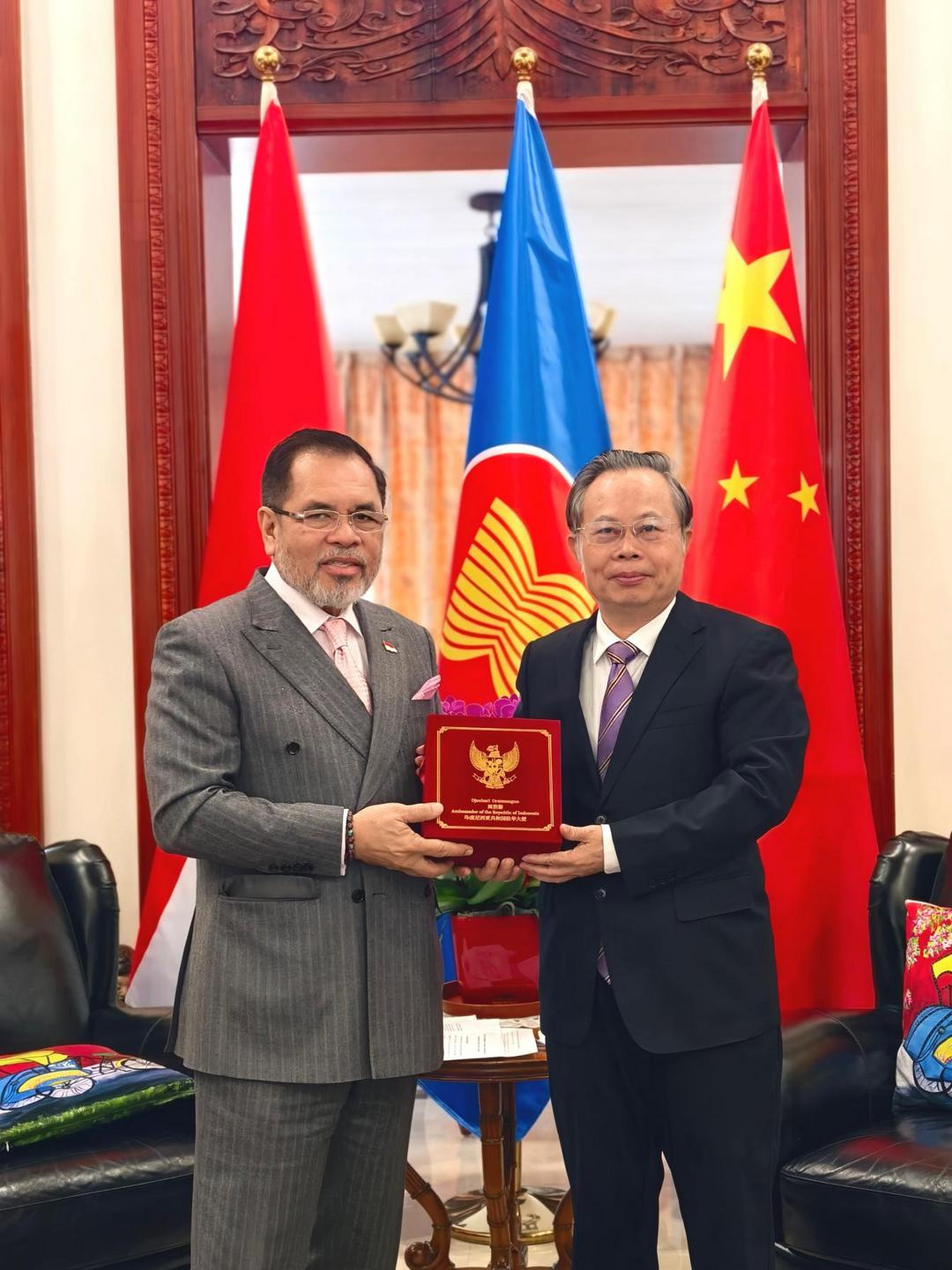 2026年2月27日,中国—东盟产业合作发展促进会常务会长、欧亚联合国际经济文化合作中心有限公司董事局主席廖斌一行走访印度尼西亚驻华大使馆,拜会印度尼西亚驻华大使周浩黎。双方围绕“驻华大使走进北京出海基地”、“全球数字经济大会‘数字经济出海国际合作论坛’”、“中国—东盟创新经济论坛”、“RCEP企业家峰会”,以及打造经贸合作交流平台等开展深入务实洽谈交流,达成多项共识。