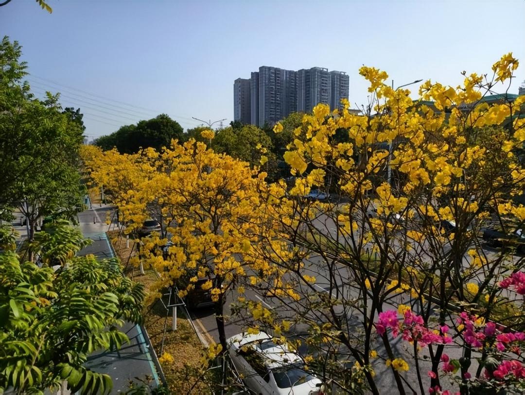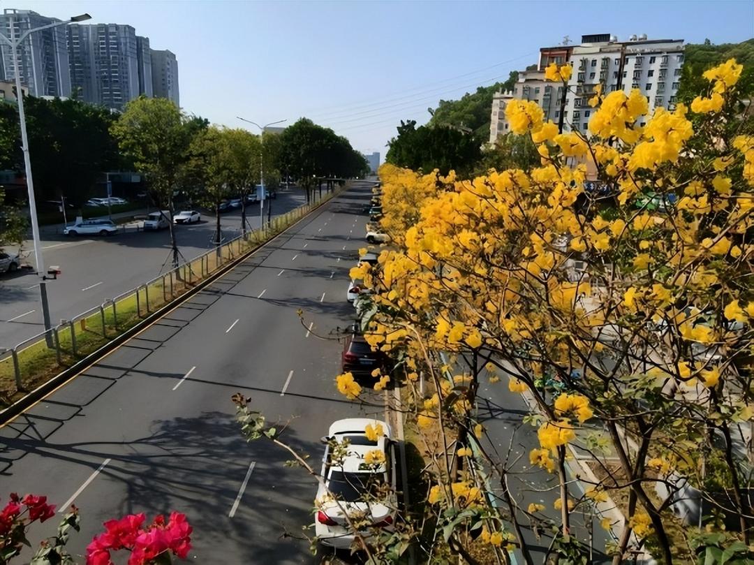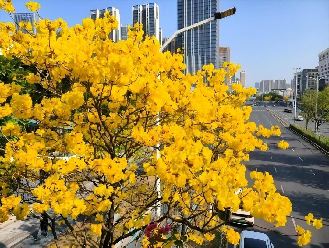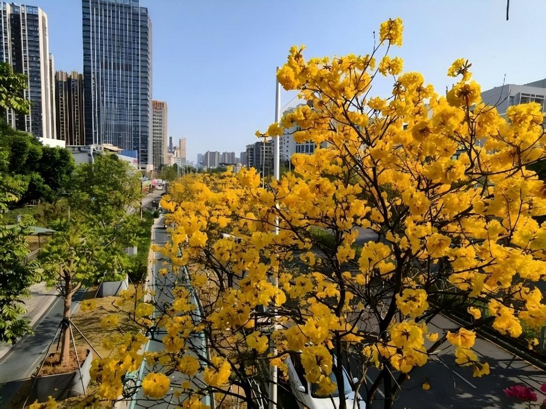 南国风暖,深圳市宝安区西乡街道前进二路沿线,黄花风铃木迎来盛花期。长约六公里的道路两侧,满目金黄绵延舒展,与城市楼宇相映成画,构成一幅生动的春日生态画卷。据悉,黄花风铃木花期为十至十五天,目前正值最佳观赏期。