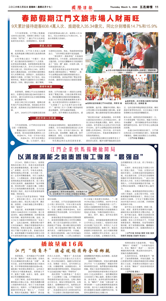 恩平则立足自身优势,推动工业、文旅、商贸、农业等多业态同步复苏,让城市烟火气与发展活力双向奔赴。其中,恩平锦江温泉、簕菜文化创意产业园等景区负责人表示,春节假期景区人气爆棚,客房入住率居高不下,外省游客显著增多,带动餐饮、住宿等相关业态回暖,接下来将总结经验,继续做好配套和服务提升工作,延续消费的活力势头。(江门日报 张茂盛 陈婵 何榕 黄胜 张舜同 陈素敏 吴健争 李淑珩)