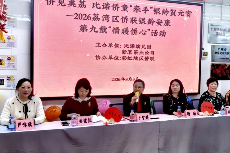 元宵团圆日,侨心相聚时。2026年3月3日(元宵节),由广州市荔湾区侨联、彩虹街道党工委指导,比诺幼儿园、新茗茶业公司主办,彩虹地区侨联协办的“侨见美荔 比诺侨童‘牵手’银龄贺元宵——2026荔湾区侨联银龄安康第九载‘情暖侨心’”活动在比诺幼儿园温情启幕。荔湾区侨联主席卜智群,彩虹街道党工委委员、办事处副主任严咏欣、区侨联副主席关健仪等领导嘉宾,海外侨领代表、归侨侨眷代表及比诺幼儿园师生齐聚一堂,以元宵为纽带,以牵手为主题,在佳节氛围中为侨界长者送上安康保障与节日关怀,让侨界互助精神在传承中绽放光彩。