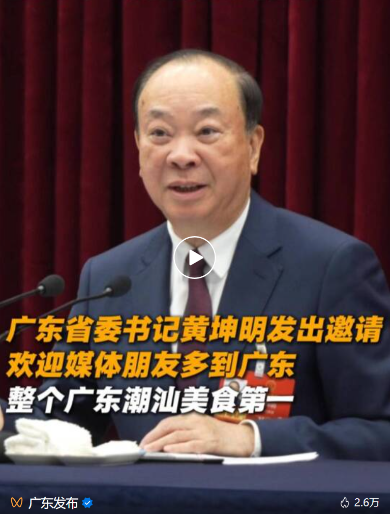 此前在广东团开放日上,省委书记向媒体诚意推荐揭阳古城、潮汕美食,称潮汕美食是“广东第一,没有之一”。