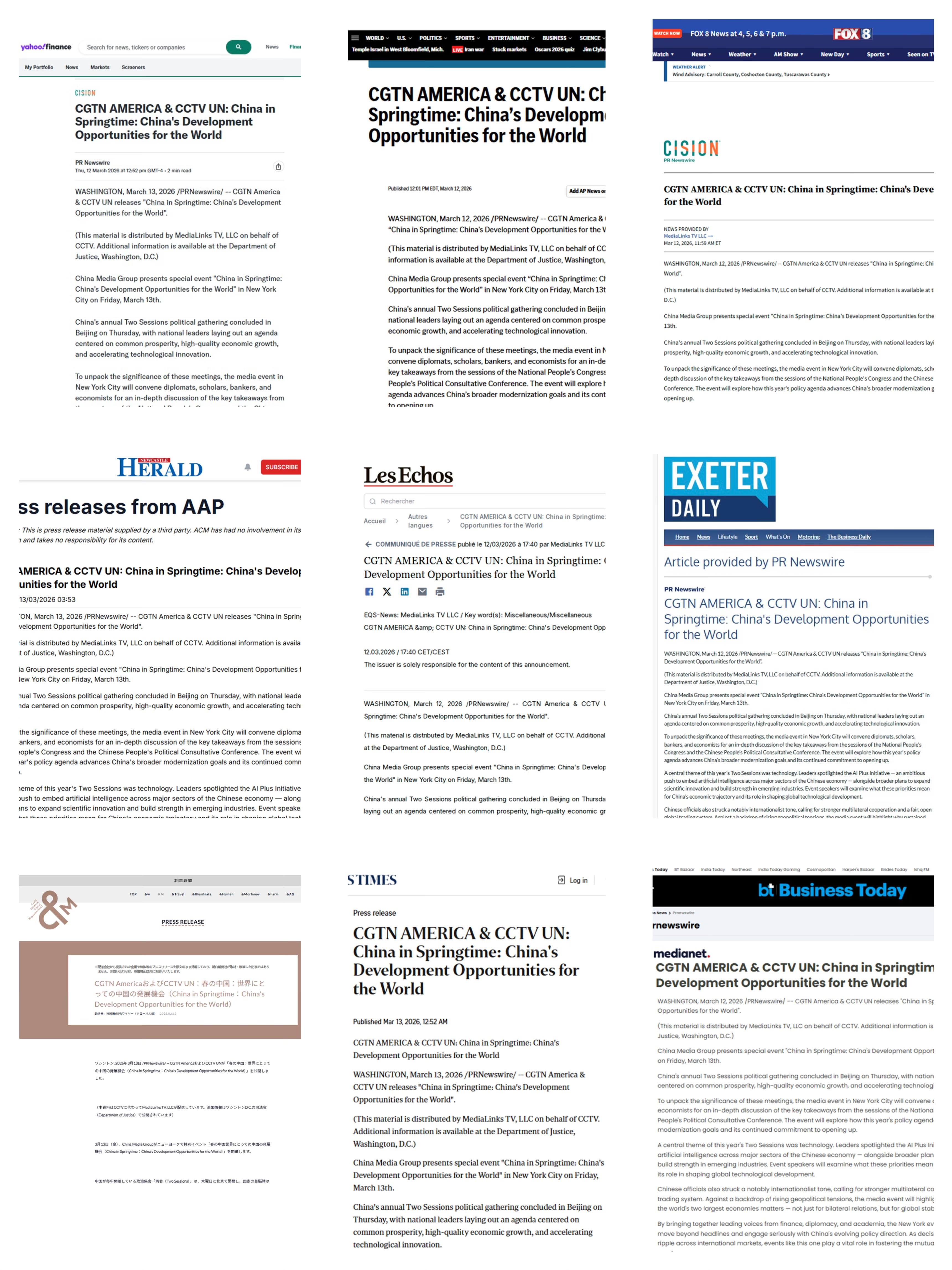 截至当地时间13日,“春天里的中国”全球对话会美国专场相关报道被美国、英国、加拿大、法国、德国、日本、韩国、新加坡、马来西亚、印度等61个国家和地区的1458家主流媒体转载转发。