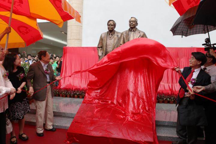 组图4,2012年,杨振宁偕翁帆为《陈省身与杨振宁》雕像揭幕。杨振宁先后六次到东莞理工学院考察指导,并专门为莞工学子设立“杨振宁奖学金”。