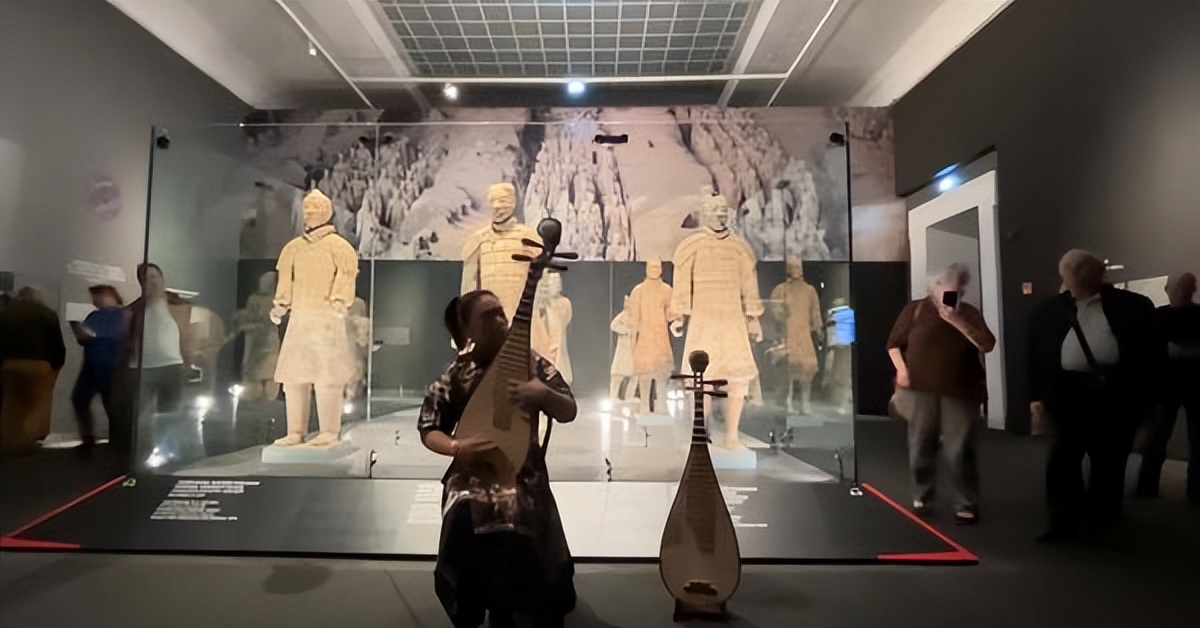匈牙利布达佩斯美术馆展厅内,10件秦始皇陵兵马俑整齐列阵,肃穆庄重。阵前,一名女子身着中华传统风格服饰,怀抱琵琶弹奏。