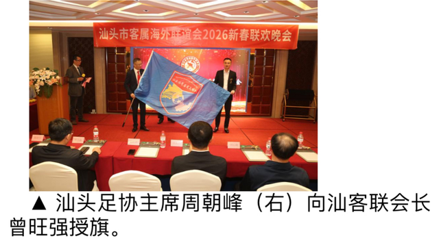 【本报讯】(记者林琳、汪锋广东省汕头报道)3月28日,汕头市客属海外联谊会(以下简称 “汕客联”)新春联欢会隆重举行 “汕头侨界客属足球队” 授旗仪式。