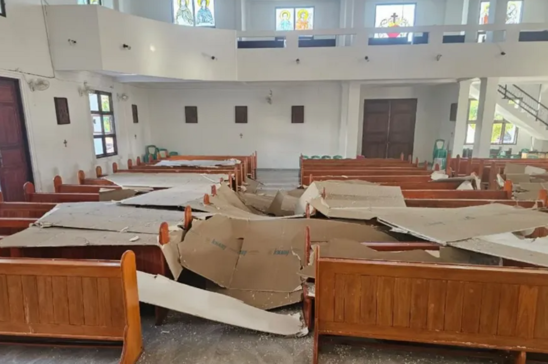 图:北苏拉威西米纳哈萨县圣心耶稣教区教堂石膏天花板在地震中坍塌