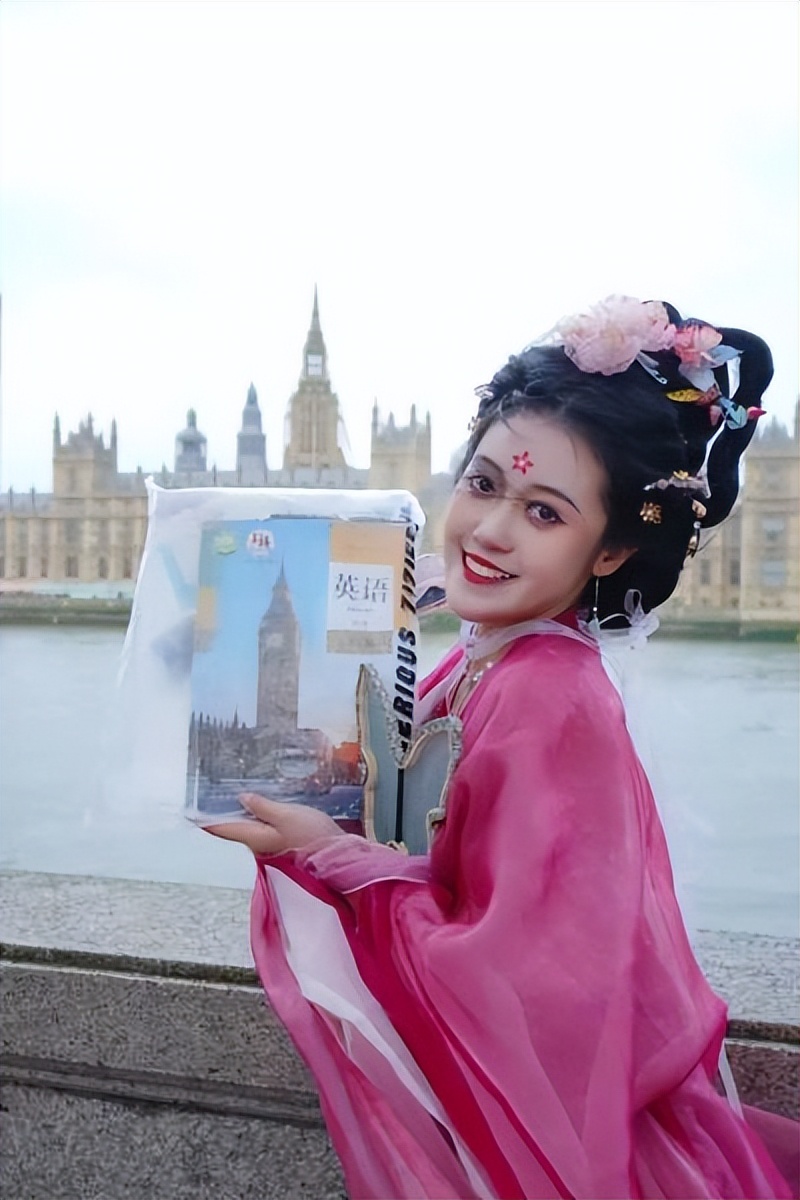 英国华威大学的中国留学生李田天一,身着汉服、手持英语课本,在大本钟前留下了特别的合影。为了这场打卡接力活动,她花了两三个小时精心做好全套汉服妆造,从考文垂市坐车一个半小时来到伦敦。