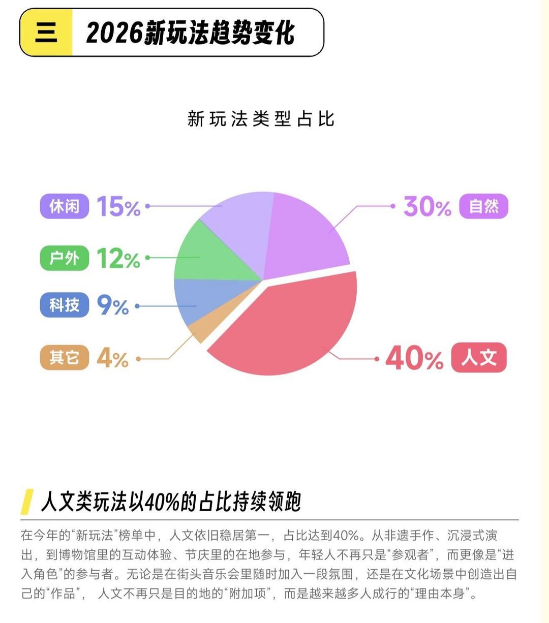 《报告》显示,人文类玩法以40%占比领跑,自然类占20%。年轻人不再满足于“看风景”,而是追求“进入场景”,强调参与感、情绪价值与社交认同。