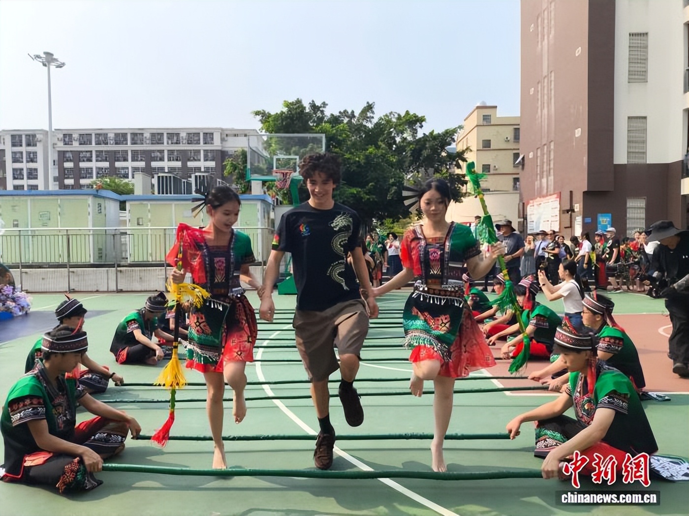 校园广场上,黎族特色的竹竿舞节奏明快,起初拘谨的美国学生在中国伙伴邀请下纷纷加入,手拉手跳跃,笑声与节拍交织在一起。