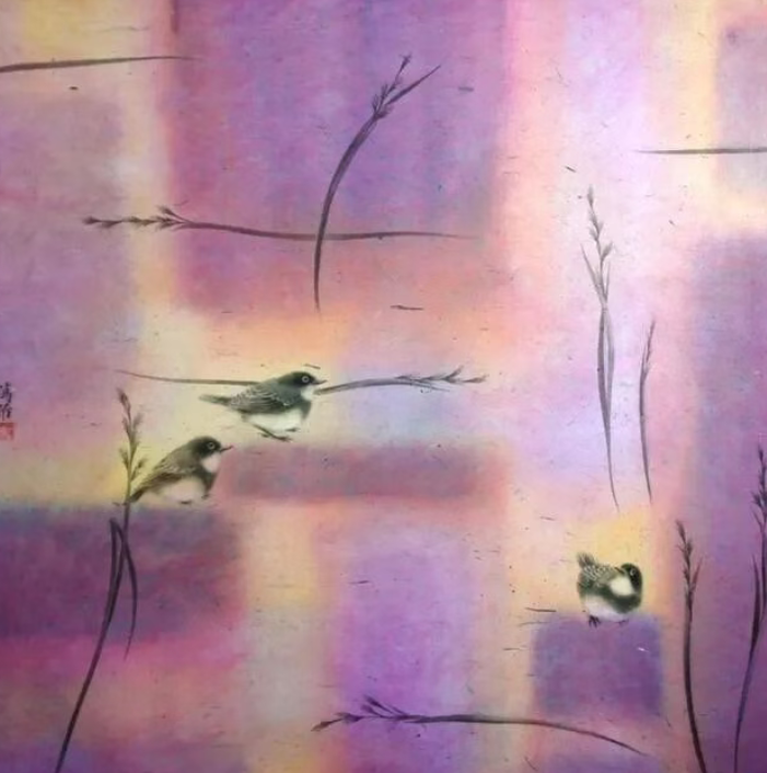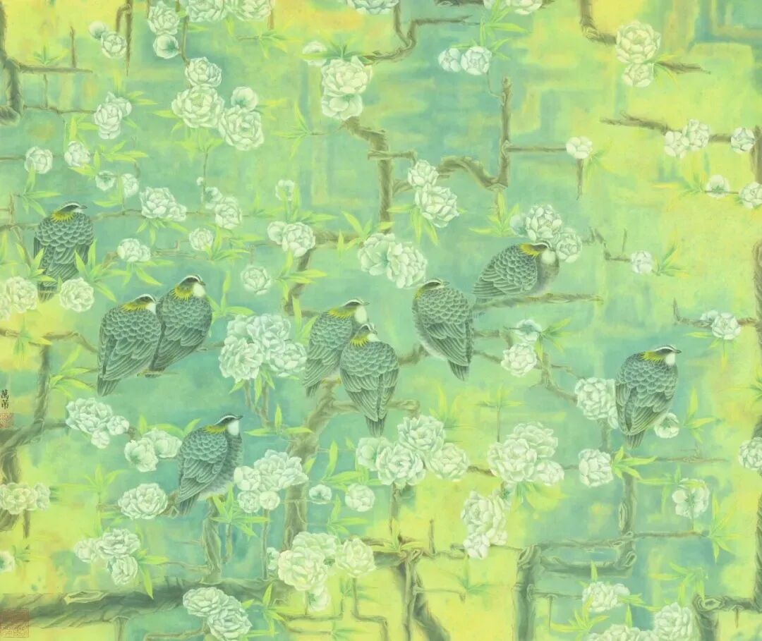 设计学科中现代构成的理念、色彩的科学搭配以及空间的解构方法,与她原本深厚的传统工笔功底产生了奇妙的化学反应,为她的跨界探索提供了有力的“武器”。从那时起,她开始尝试突破传统花鸟画的既有范式,给画作注入现代的、理性的视觉思维,创造出一种既有传统韵味又具有现代感的独特风格。