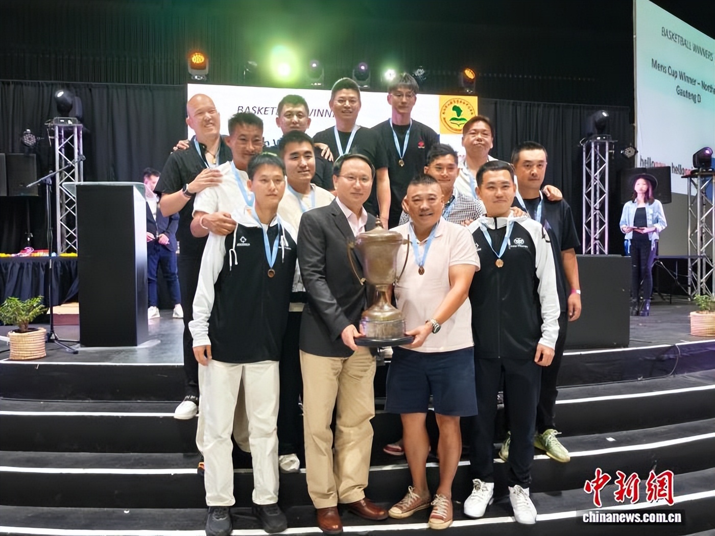 中国驻南非大使馆公使周茂义为男篮冠军北豪登省D队颁奖。(主办方供图)