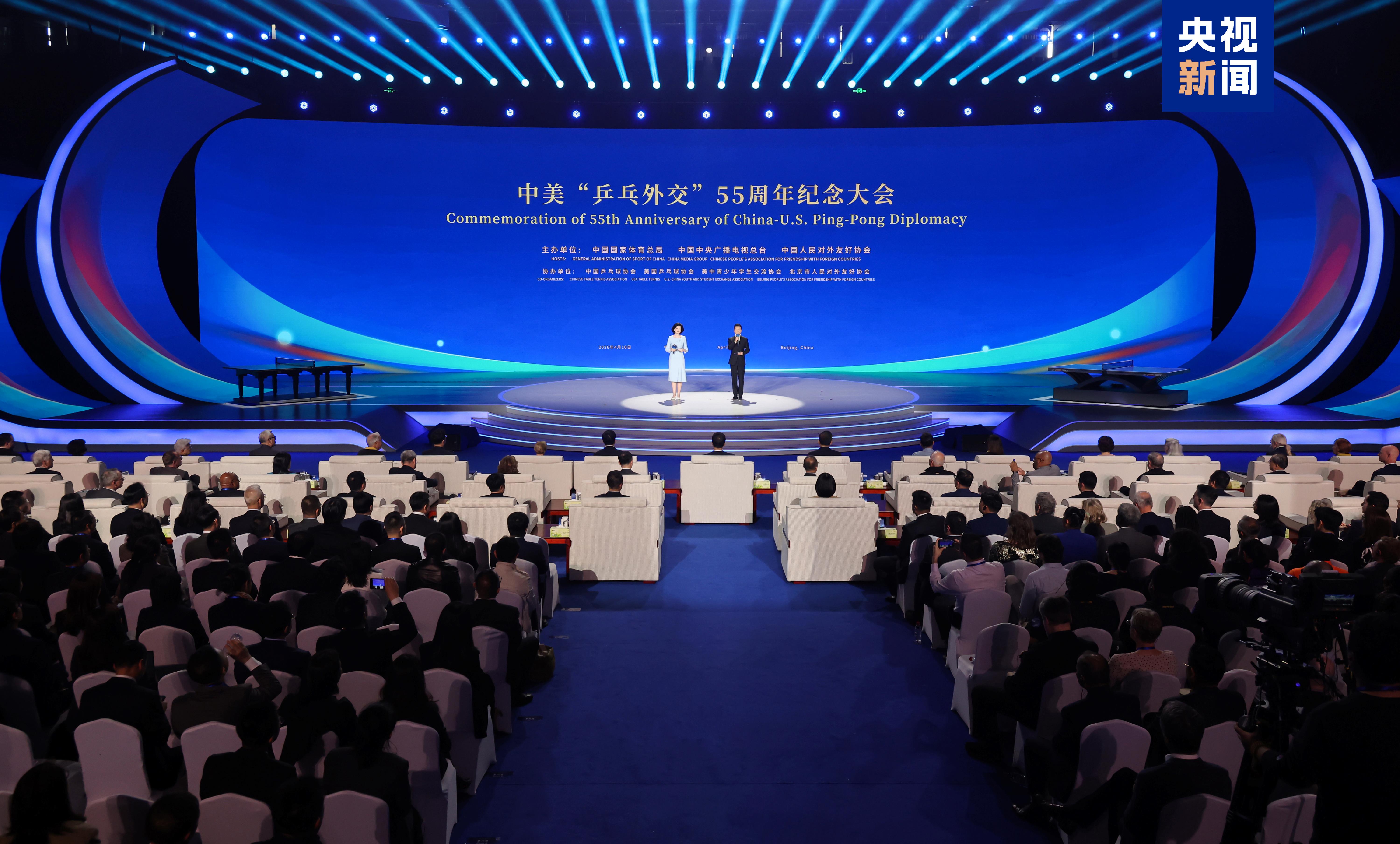 4月10日,中美“乒乓外交”55周年纪念大会在北京首都体育馆举行。大会由中国国家体育总局、中国中央广播电视总台、中国人民对外友好协会共同主办,中国乒乓球协会、美国乒乓球协会、美中青少年学生交流协会、北京市人民对外友好协会协办。纪念大会以“同球共济 和合共赢”为主题,重温“小球转动大球”的历史性时刻,赓续中美民间友好传统,推动两国青少年体育人文交流持续深化。来自中美两国政府及机构代表、国际组织代表、中美“乒乓外交”亲历者代表、体育界知名人士、媒体界代表及两国青少年代表等500余位嘉宾出席活动。“中美青少年体育交流系列活动”正式启动。