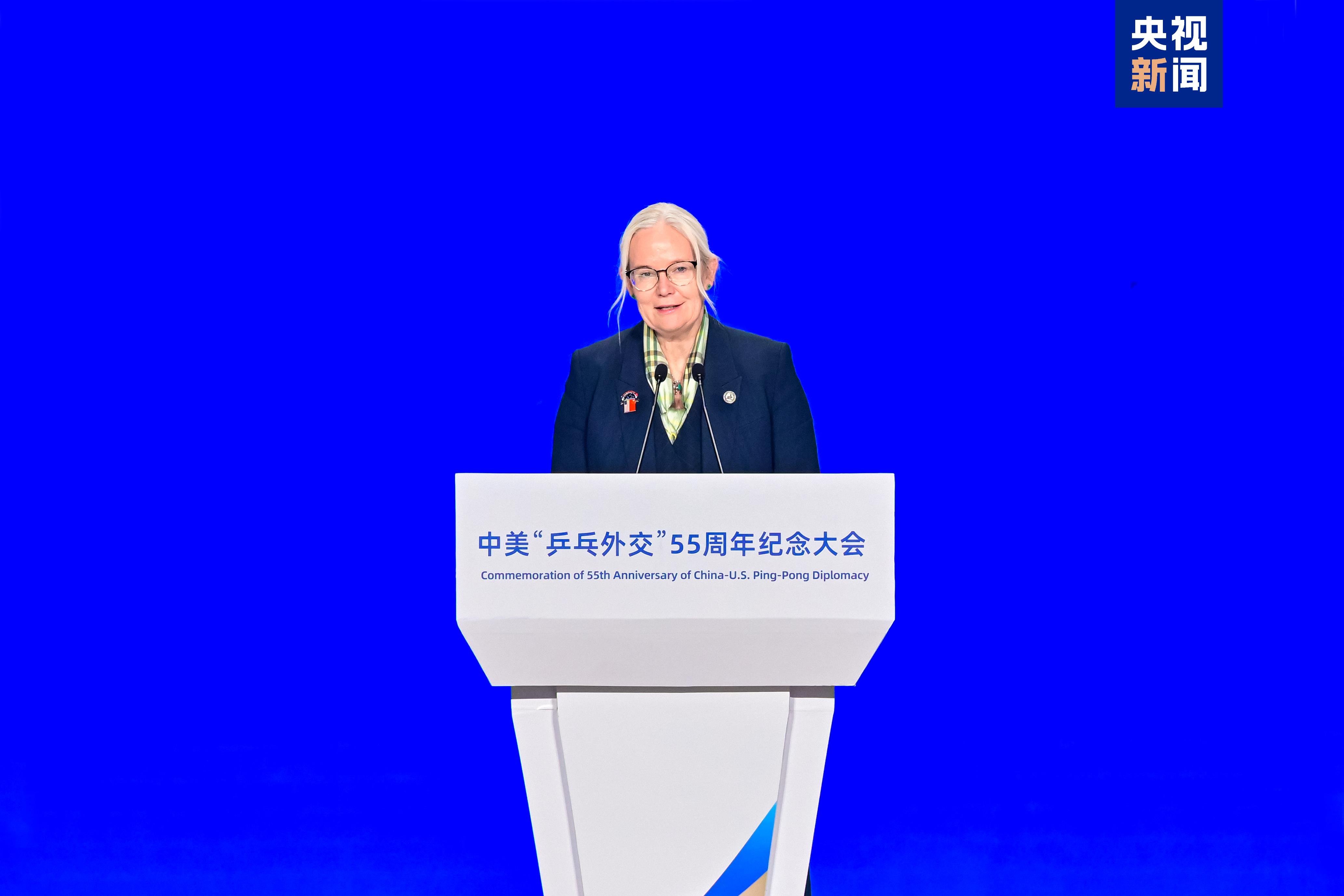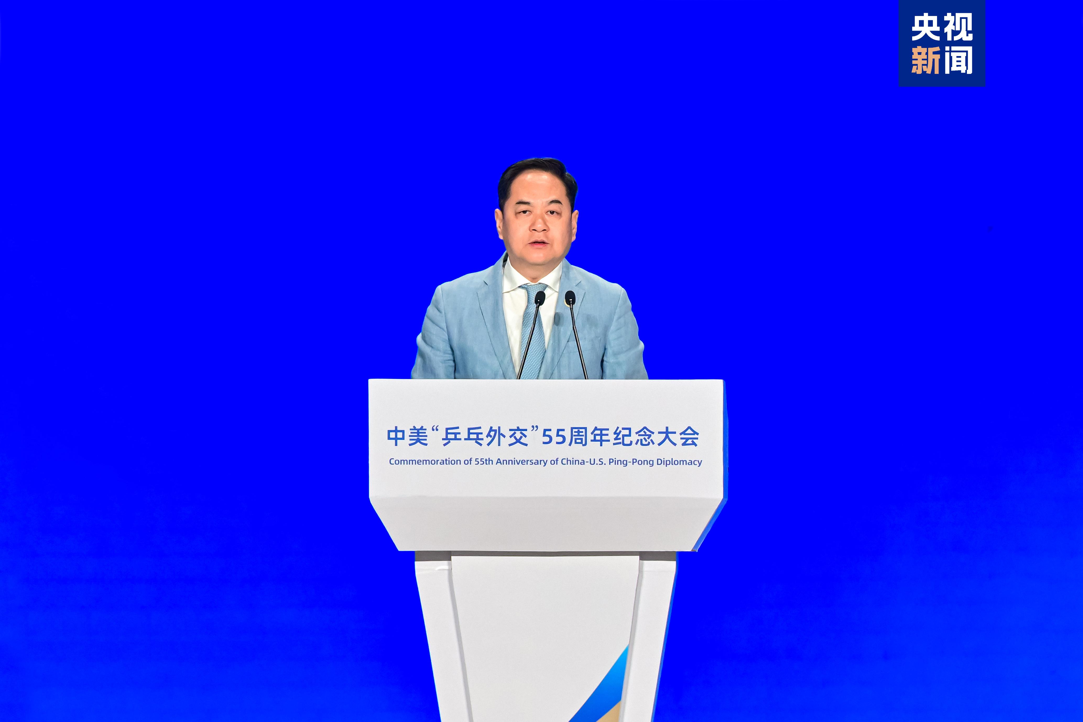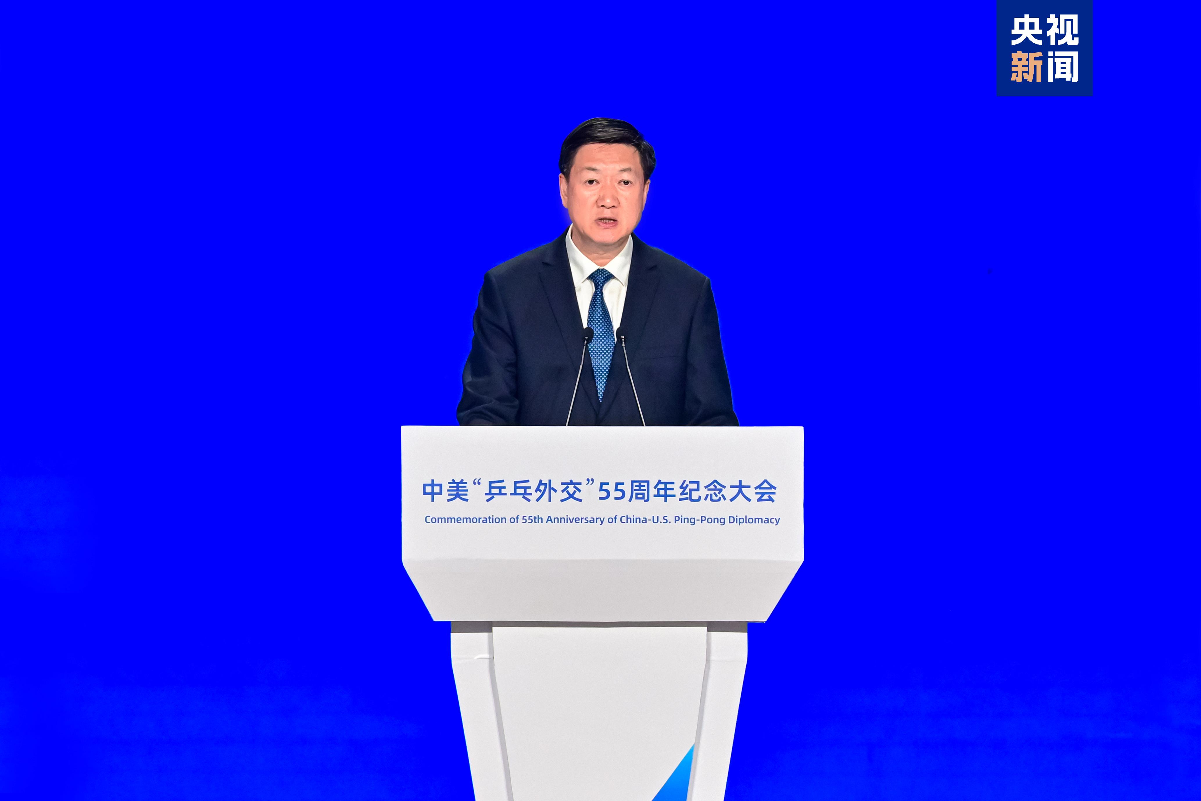 国家体育总局局长高志丹在致辞时表示,体育是人类共同语言,是促进民心相通和文明互鉴的桥梁纽带。55年来,在“乒乓外交”精神感召下,中美两国体育界开展了广泛深入而富有成效的交流与合作,为两国关系健康发展持续注入稳定性和正能量。体育承载着人类对和平、团结、进步的美好追求,为两国人民特别是青少年共同喜爱。期待两国青年一代接过友谊的接力棒,让和平、友谊、合作的种子在两国青年心中生根发芽,让“乒乓外交”的火种代代相传、生生不息。国家体育总局愿同包括美国在内的国际体育界携手前行,共同践行“更快、更高、更强——更团结”的奥林匹克格言,持续发挥体育独特作用和综合价值,为中美“乒乓外交”赋予新的时代内涵,为促进两国民心相通、增进世界人民友谊、推动构建人类命运共同体作出新的更大贡献。