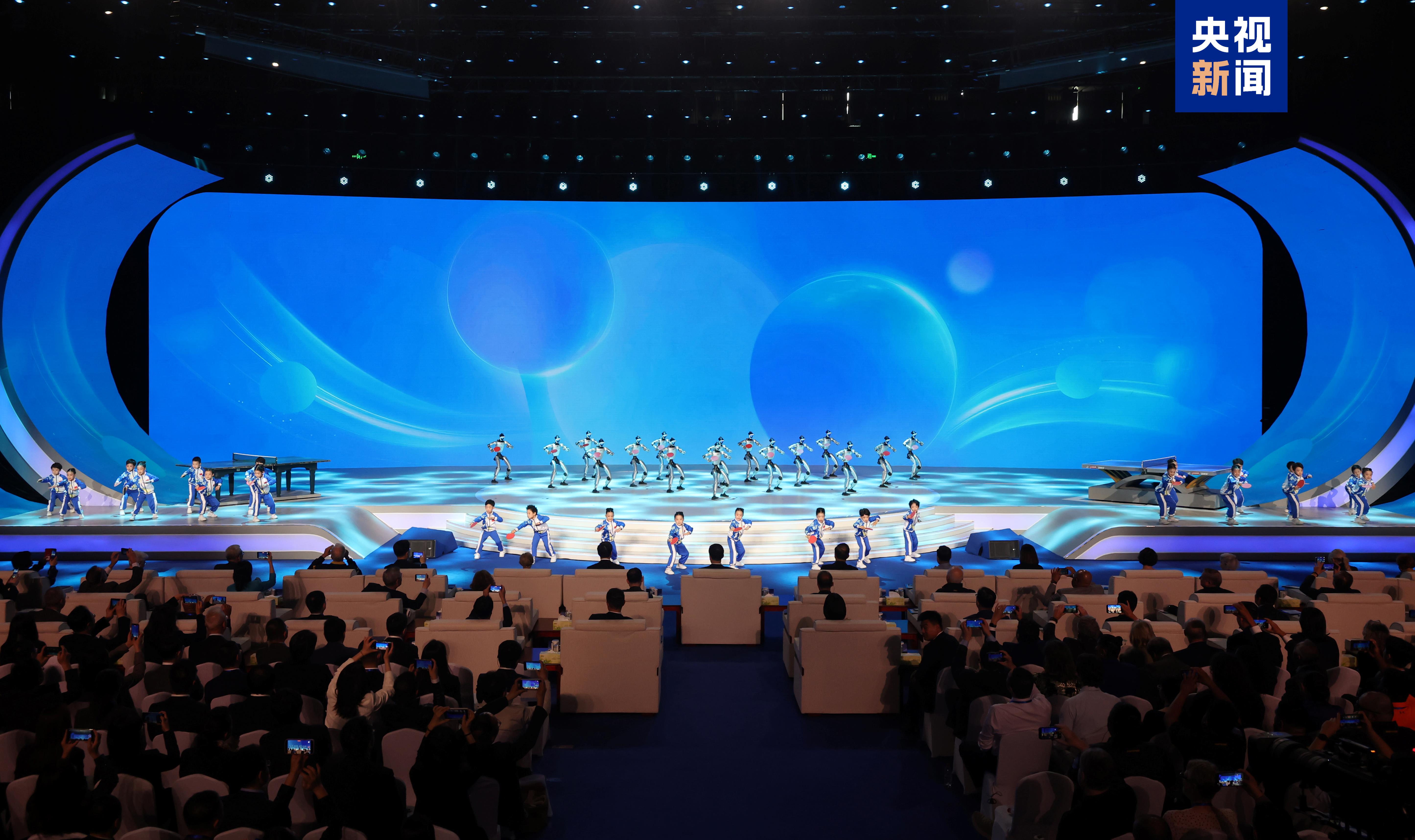 人机共舞节目《跃动乒乓》活力上演。舞台上,少年儿童与机器人并肩起舞,以灵动的舞姿衔接挥拍对打等专业动作,将乒乓球运动的竞技张力与科技创新的独特魅力融为一体,生动诠释出乒乓运动的跃动之美。