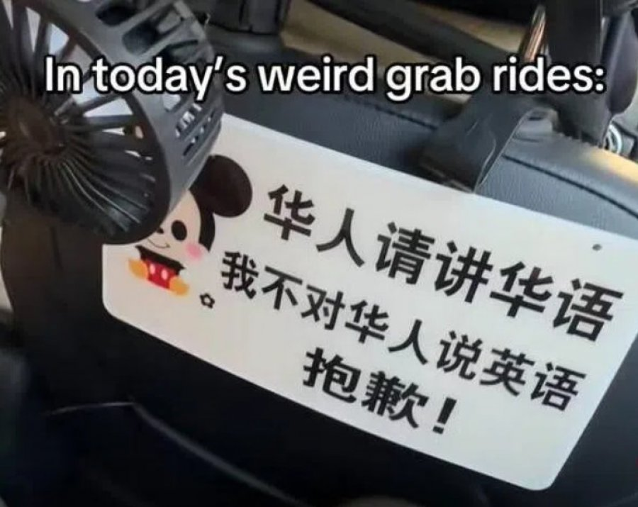 近日,新加坡一对用英语交谈的夫妇乘坐Grab私召车时,发现驾驶座椅背贴有“华人请讲华语,我不对华人说英语,抱歉!”的标语,女乘客因司机的冷漠态度及标语内容感到不满,将经历拍成视频上传至TikTok平台,引发网友广泛热议。