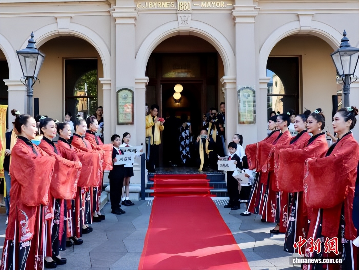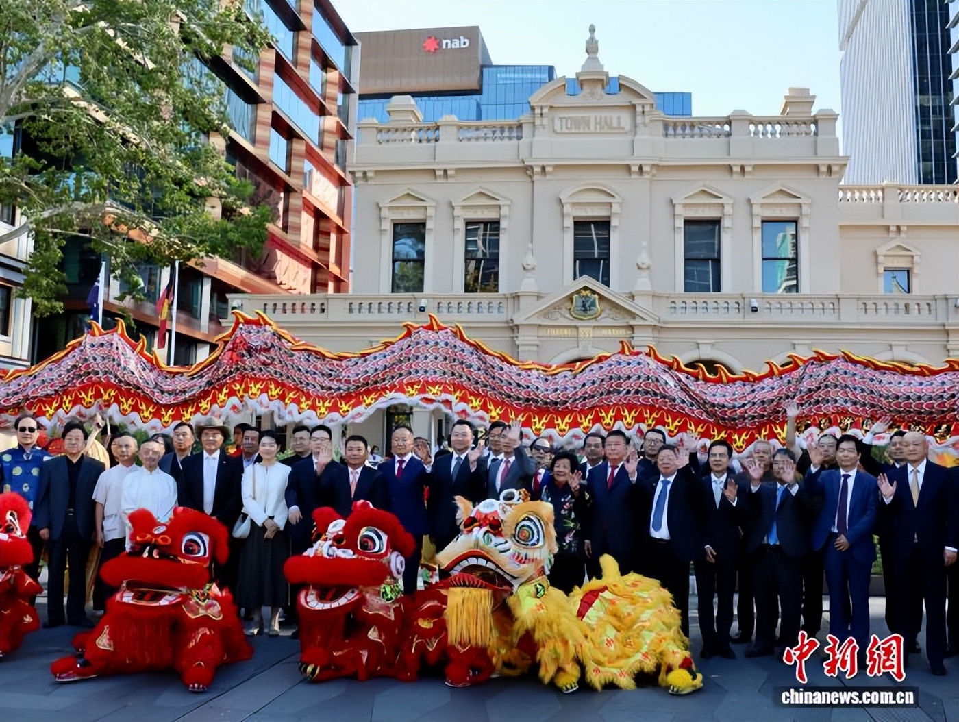 当日上午,位于悉尼西部的帕拉玛塔市政厅外锣鼓喧天、醒狮欢舞,一面面姓氏旗迎风招展,数百名澳大利亚华侨华人代表齐聚于此。