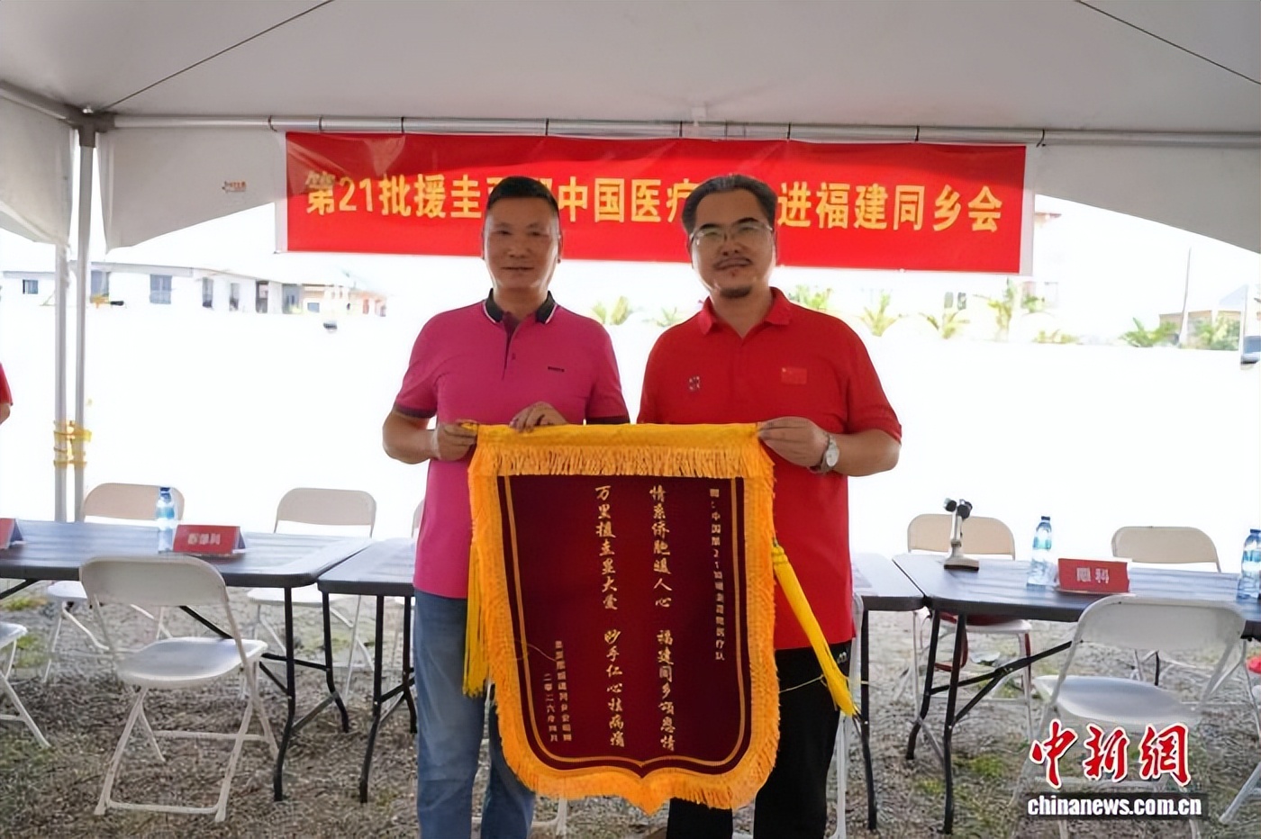 圭亚那福建同乡会陈明会长在现场代表同乡会给援圭医疗队赠送了锦旗,并表示,医疗队放弃周末休息时间上门服务,真正解决了大家“小病拖,大病扛”的痛点,“在异国他乡,见到亲人的面就是最好的药”。