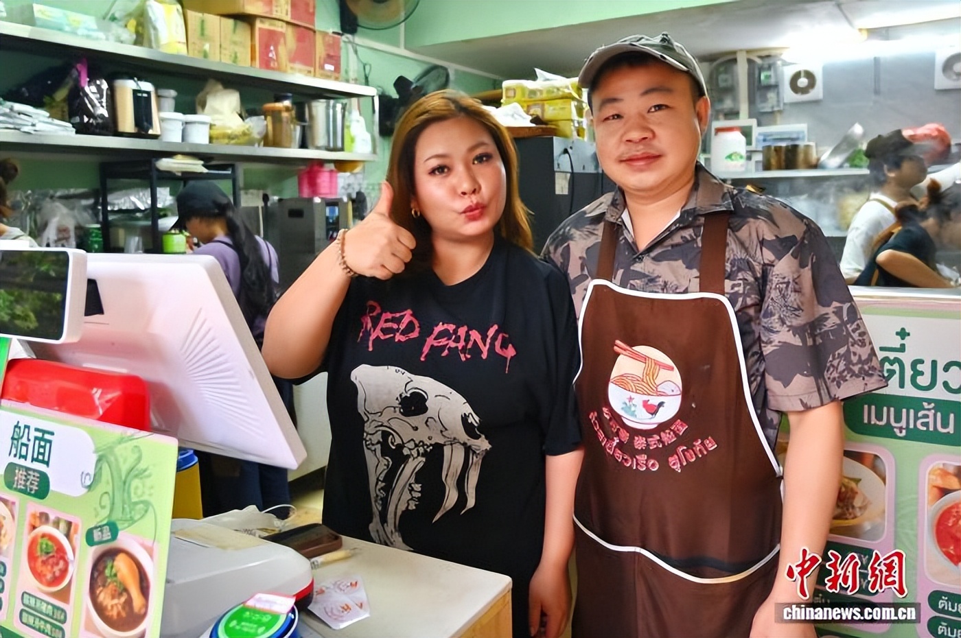 图为泰国媳妇邓秀杰与丈夫苏伟在面馆留影。俞靖 摄