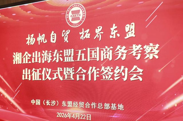 4月22日下午,湘企出海东盟五国商务考察出征仪式暨商务合作签约活动在中国(长沙)东盟经贸合作总部基地二楼会议厅隆重举行。本次活动以搭建湘企与东盟五国经贸合作桥梁为核心目标,着力推动湘企抱团出海、深耕东盟市场,助力湖南加快打造内陆地区改革开放高地。省、市、区相关部门领导及企业代表共计60余人出席本次活动。