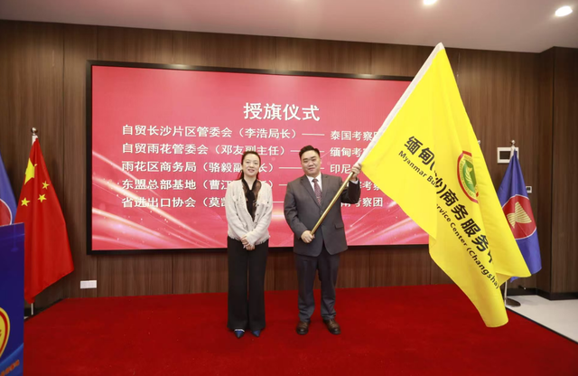 出征仪式环节氛围庄重热烈,自贸长沙片区管委会产业发展局局长李浩、自贸雨花管委会党工委委员、副主任邓友等领导分别为五个出海考察团授旗,标志着湘企出海东盟五国商务考察正式启航。考察团代表现场宣誓,承诺将严格遵守各项纪律、坚持诚信合作,充分展现湘企良好形象,全力以赴完成本次考察任务。随后,全体嘉宾共同启动出海考察活动,共同吹响湘企出海奋进的号角。