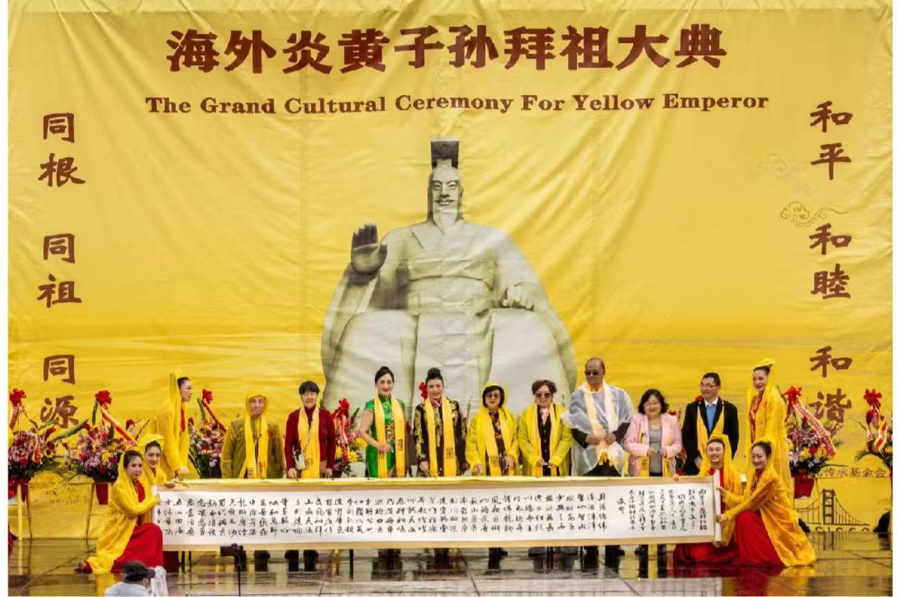 醒獅騰躍、鑼鼓鏗鏘。馬世雲財務長、美國加州參議員威善高、陳小焱議員、索諾瑪市市議員丁駿輝、中華婦女聯合會會長何孔華等政要及僑界代表依次登台,向黃帝像敬獻花籃,以莊重之禮寄託對人文始祖的敬仰與追思;中文演講比賽獲獎者、青少年代表與嘉賓共同獻花,表達敬意;肇慶總會館、三邑總會館等僑團代表及文化界人士依次淨手上香,追思祖德祖恩,祈願和平和睦;全體嘉賓肅立,向黃帝像三鞠躬;大典組委會總指揮胡長橋遞交拜祖文,丁駿輝議員現場恭讀。