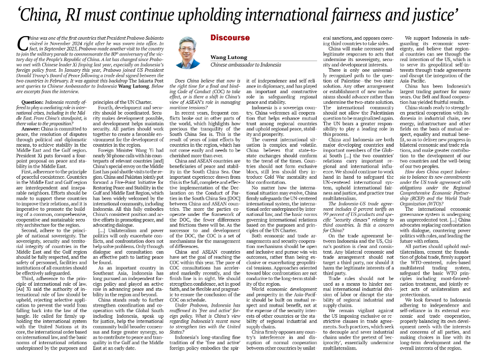 据中国驻印尼大使馆消息,4月22日,王鲁彤大使接受《雅加达邮报》专访,就中印尼经贸合作、南海局势、东盟合作、全球供应链等全球热点问题与中东形式阐明中方立场,专访全文如下: