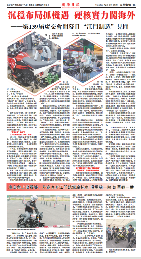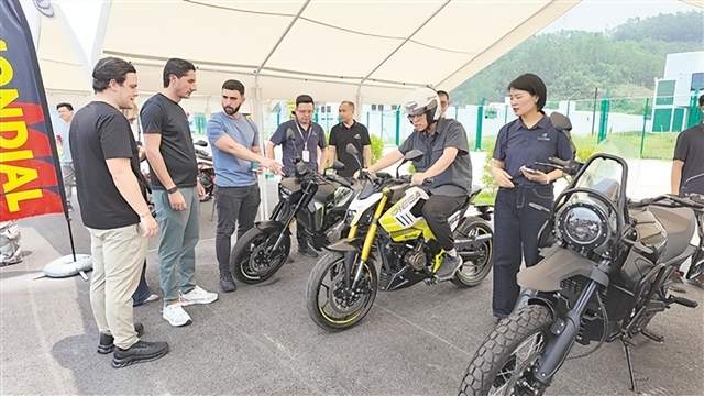 “广交会上,我们仅展出8台样车,却凭借亮眼设计、可靠性能和精准的海外市场适配性,迅速抓住了全球客商的目光。”江门市摩托车产业链党委书记、珠峰摩托副总经理覃斌介绍,为了实打实核验企业产能、品控水平,更直观地感受车辆的真实驾乘体验,来自意大利、阿根廷、刚果(金)等全球近10个国家和地区的客商,专程从广交会展馆奔赴江门,试驾十余款全系列车型。