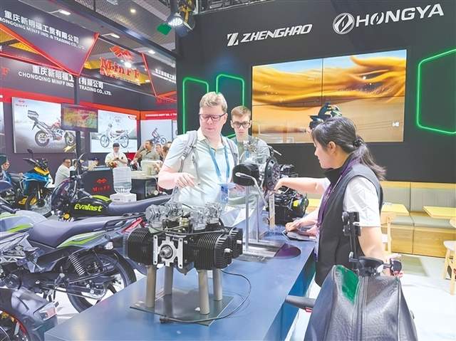 在珠峰摩托展区,外国客商认真察看企业新产品。