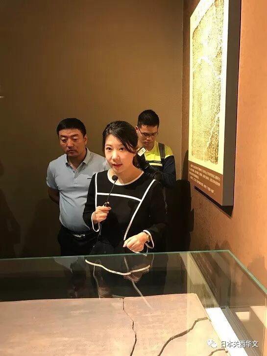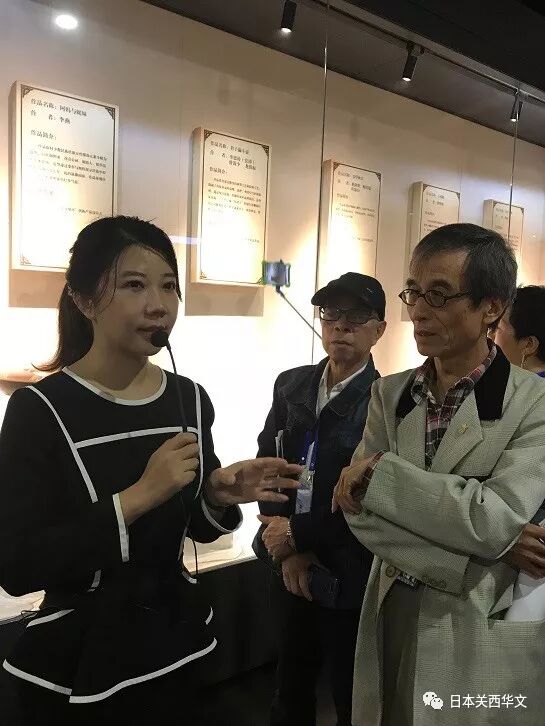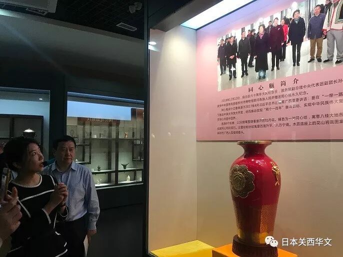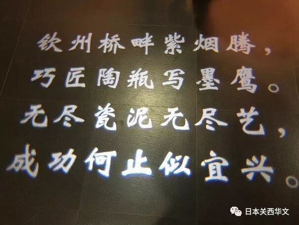 让《关西华文时报》副总编蒙令华尤为兴奋的是,参观线路的入口处地面上由射灯照射显示的一首诗:“钦州桥畔紫烟腾,巧匠陶瓶写墨鹰,无尽瓷泥无尽艺,成功何止似宜兴。”贾文园告诉大家,这是中华人民共和国国歌的词作者田汉先生于1962年到钦州考察时写下的诗。蒙令华副总编随后告诉她说,真巧,田汉先生的侄女田伟就在日本,而且是《关西华文时报》的记者和多年的专栏作者。蒙令华副总编随后还拍照,并把记载有田汉先生1962年视察钦州的文章一起转给了田伟。