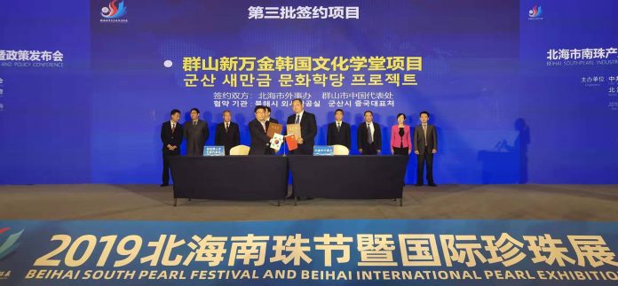 王乃学在致辞中说,近年来,北海市高举向海经济发展的大旗,坚持抓项目、抓招商、抓产业、抓营商环境、抓生态环境,大力推动产业、城市、生态高质量发展,引进和推进了一大批投资额超百亿、产值超百亿的大项目,形成了项目建设热火朝天、经济发展生机勃勃的喜人局面。他强调,北海市委、市政府对振兴南珠产业有坚定的决心、足够的信心,北海振兴南珠产业的新序幕已经拉开,发展南珠产业,北海有最大的空间、最好的生态、最优的政策,真诚欢迎各界人士到北海投资兴业,携手将北海打造成为世界级的珍珠集散地。