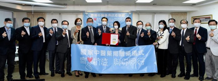 上圖:國家中醫藥管理局贈送中成藥「連花清瘟膠囊」以及口罩、洗手液等「抗疫包」給「香港中醫藥界抗疫聯盟」,助市民抗疫情。
