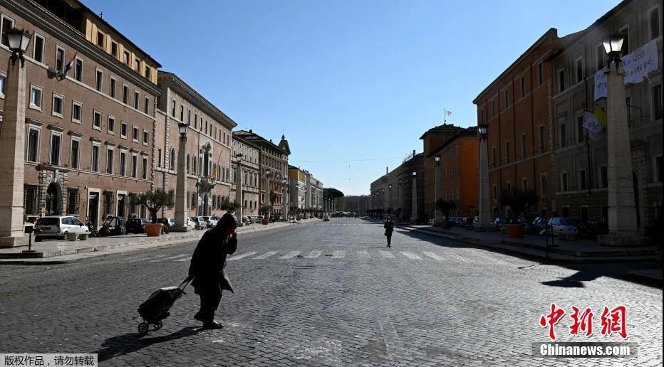 资料图:意大利把3月起实施的抗击新冠疫情的封锁措施,延长至4月13日。图为行人穿过空旷的罗马街头。(中新网)