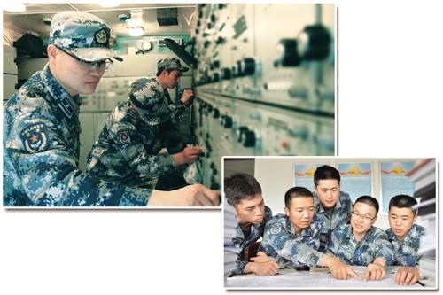 上图 截获军官何锋(左一)日常维护指控舱装备。