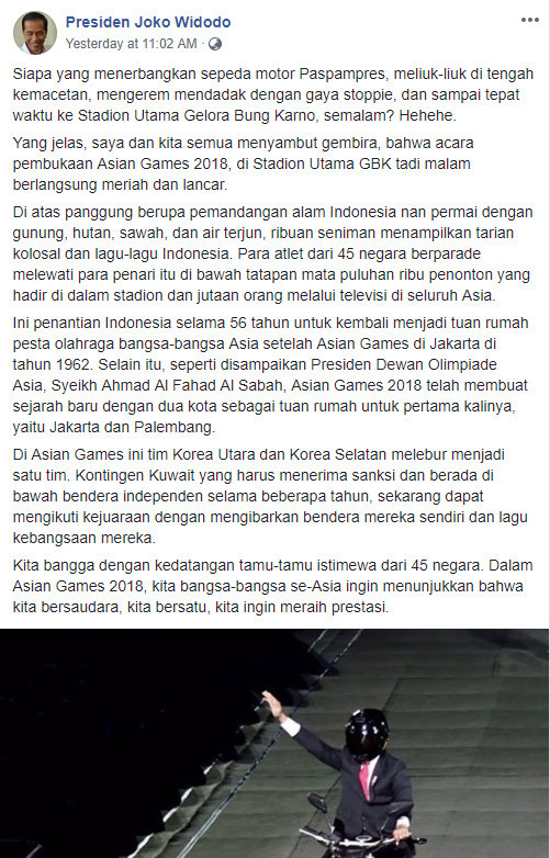 2018雅加达亚运会开幕式在朋加诺体育馆正式开幕,印度尼西亚总统佐科驾驶着单人摩托车入场使得整个体育场沸腾,各路网友大呼印尼总统真的“会玩”。
