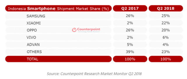 Counterpoint的统计报告显示,二季度三星电子在印尼的份额同比只减少了1个百分点。不难看出,小米的异军突起并未伤害到三星的份额,而OPPO品牌受到小米的影响则是最大。
