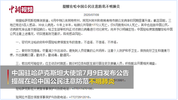 中国驻哈萨克斯坦大使馆9日发布公告表示,已有在哈中国公民因感染不明肺炎死亡。大使馆提醒中国公民切实提高防范意识,降低感染风险。