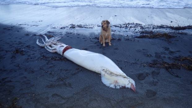 据报道,三名潜水爱好者到新西兰首都威灵顿海边游玩,在惠灵顿南部附近发现一只巨型乌贼尸体被冲上了海滩上。经过测量,这鱿鱼尸体长4.2米。发现者Daniel笑称:“他们在潜水旅行时遇到过乌贼,但从未见过这样大小的乌贼。不仅狗狗坐在旁边都显得相当娇小,就连一名成人男性躺平对比也矮上一截。