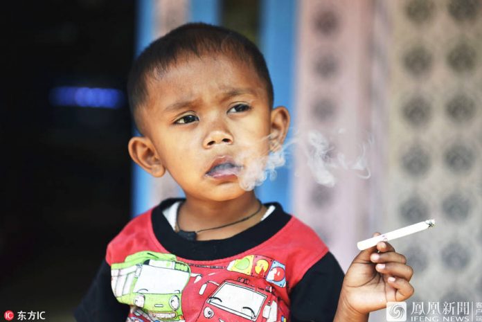 2018年8月29日,家住在印尼苏加武眉地区的两岁男童Rafi Ananda Pamungkas小小年纪却有这很大的烟瘾,一天竟要抽上两包的烟,如果不给他烟的话,他就会不停地哭闹。供图:东方IC