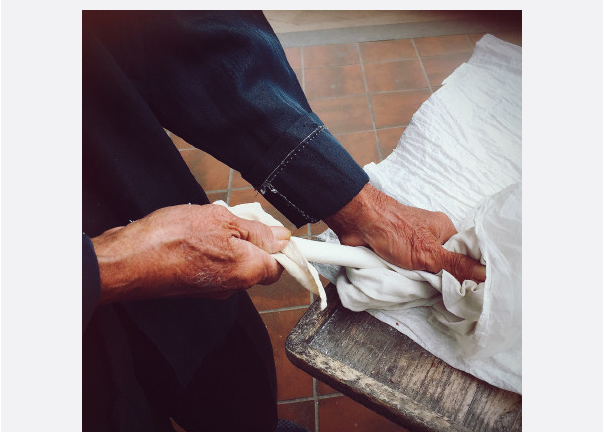 长筒型的白条糖,用手抓住慢慢拉扯,原本碗口大的白条糖拉成了大拇指粗细,再用剪刀轻轻一剪,放入嘴中咬一口,白糖裹着芝麻花生碎,清甜香酥。