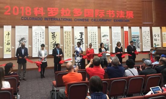 【本报讯】由美国洛矶山中华书法学会、丹佛社区大学孔子学院、奥罗拉市图书馆、奥罗拉市国际移民办公室,和中美邮报联合举办的2018科罗拉多国际汉字书法展,8月25日(周六)下午在奥罗拉市图书馆内会议大厅隆重开幕式,130位中美各界嘉宾朋友出席当天的活动。