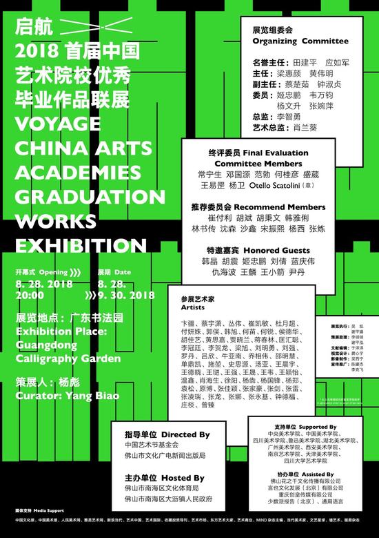 2018年8月28日,“启航——2018首届中国艺术院校优秀毕业作品联展”在广东书法园开幕,此次展览“启航——中国艺术院校优秀毕业作品联展”以“创建平台、助力精锐、引智入地、开启未来”为宗旨,呈现多元化和年轻态的艺术,旨在鼓励青年艺术语言的探索及多元艺术创作方式的共生,探寻青年艺术家的良性发展模式,助力青年艺术家的个人成长。