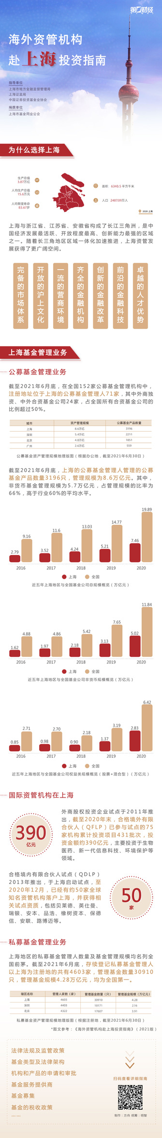 中國新聞聚焦上海HIGHLIGHT MEDIA 海外資管機構赴上海投資指南(2021版)今發布 By highlight media - 2021 年 10 月 13 日 一份致力於為外資機構在中國、在上海佈局展業提供幫助和便利的行動指南——《海外資管機構赴上海投資指南(2021版)》今天在2021上海全球資產管理高峰論壇上正式發布。 作為中國改革開放的重要窗口和發展成就的生動縮影,上海正在成為全球金融機構最集中、金融要素市場最齊備、金融環境最友好的城市之一。優良的營商環境,積極的金融創新,專業的金融服務讓上海這座城市獲得了全球機構的青睞,集聚效應明顯。 據第一財經報導,截至2020年末,上海持牌金融機構總數達1674家,比2015年末增加196家,外資金融機構佔比近三分之一。外資法人銀行、保險機構、基金管理公司均佔內地總數的一半左右,成為境內外資金融機構最集中的城市之一。全球資管規模排名前十的資管機構均已在滬開展業務,全國33家外資私募證券投資基金管理人(WFOE PFM)中有29家落戶上海。 去年,為幫助有意來中國開展業務的資產管理公司了解上海,提供展業的前期準備、申辦手續、營商政策、專業服務機構等訊息,由中國證券投資基金業協會和上海市基金同業公會,共同編撰了全國首個城市為海外資管機構推出的官方指南性文件《海外資管機構赴上海投資指南》中英雙版。今年,結合最新的政策方向和投資形勢,在對指南進行更新之後,《海外資管機構赴上海投資指南(2021版)》將在今天正式發布。這本指南在編撰和修訂過程中得到了上海市地方金融監管局、上海證監局、中國證券投資基金業協會的指導與幫助。通力律師事務所、畢馬威企業諮詢(中國)有限公司、上海光大資產管理有限公司、上投摩根基金管理有限公司對本指南修訂作出重要貢獻。 《海外資管機構赴上海投資指南》2021版延續2020年版的宗旨,以優化外商便利化進程和促進本土化融合為原則,由十二個章節組成,覆蓋地理區位、行業概述、政策法規、申請審批、業務開展、機構服務六大類,結合行業實踐和行業數據,向來滬和在滬外資機構提供指導性參考。 第一財經指出,對比2020版,《指南》2021版對宏觀統計和行業數據進行了全面更新,新增上海地區有關“十四五”規劃和“先行先試”的具體措施,調整細化機構設立的流程和實操環節,增加私募股權投資基金相關內容,對基金的合規以及稅收制度進行了充分歸納,將基金募集環節延展至私募投資;並將《關於加快推進上海全球資管中心建設的若干意見》作為附件納入《指南》,以期幫助讀者更全面深入地了解上海建設全球資管中心願景和決心。 上海是一座激動人心的城市,這裡開明睿智、大氣謙和;上海是一座海納百川的城市,這里人才薈萃、百業齊興;上海也是資產管理領域要素集聚度高、國際化水平強的城市,這裡聚八方來客,享開放紅利。 2021年,上海國際金融中心建設將開啟更高能級的發展征程,外資機構也將以更積極的姿態佈局資管市場,上海的服務“新高地”和政策配套也將進一步完善。 2021版《海外資管機構赴上海投資指南》將給更多外資機構在中國,在上海展業提供幫助,提供便利。 下载指南全文,请掃碼右下角二維碼查看。