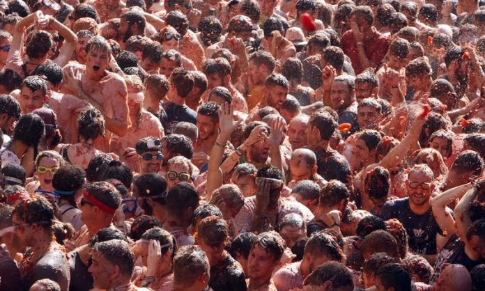 当地时间2018年8月29日,西班牙瓦伦西亚地区布尼奥尔小镇,举行了一年一度的“番茄节”,人们互相扔番茄,场面嗨翻天。