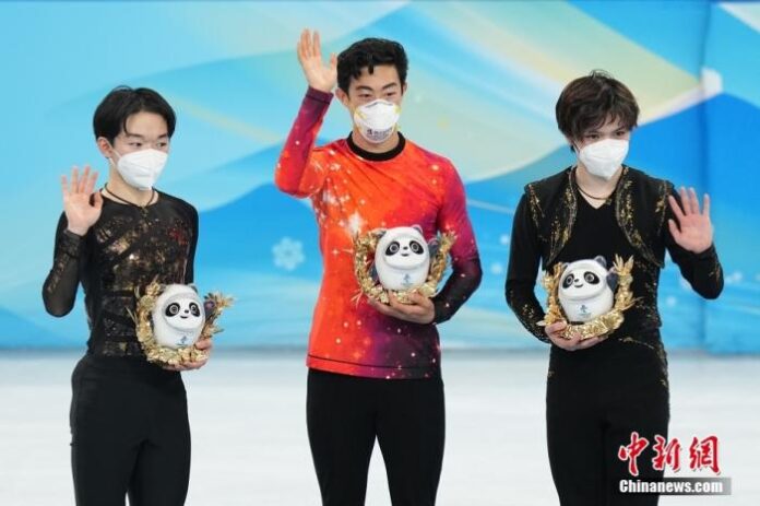 2月10日,北京2022年冬奧會花樣滑冰男子單人滑自由滑比賽在首都體育館舉行。美國選手陳巍奪得冠軍,日本選手鍵山優真、宇野昌磨分獲二、三名。圖為陳巍(中)、鍵山優真(左)、宇野昌磨比賽后慶祝。中新社記者 崔楠 攝