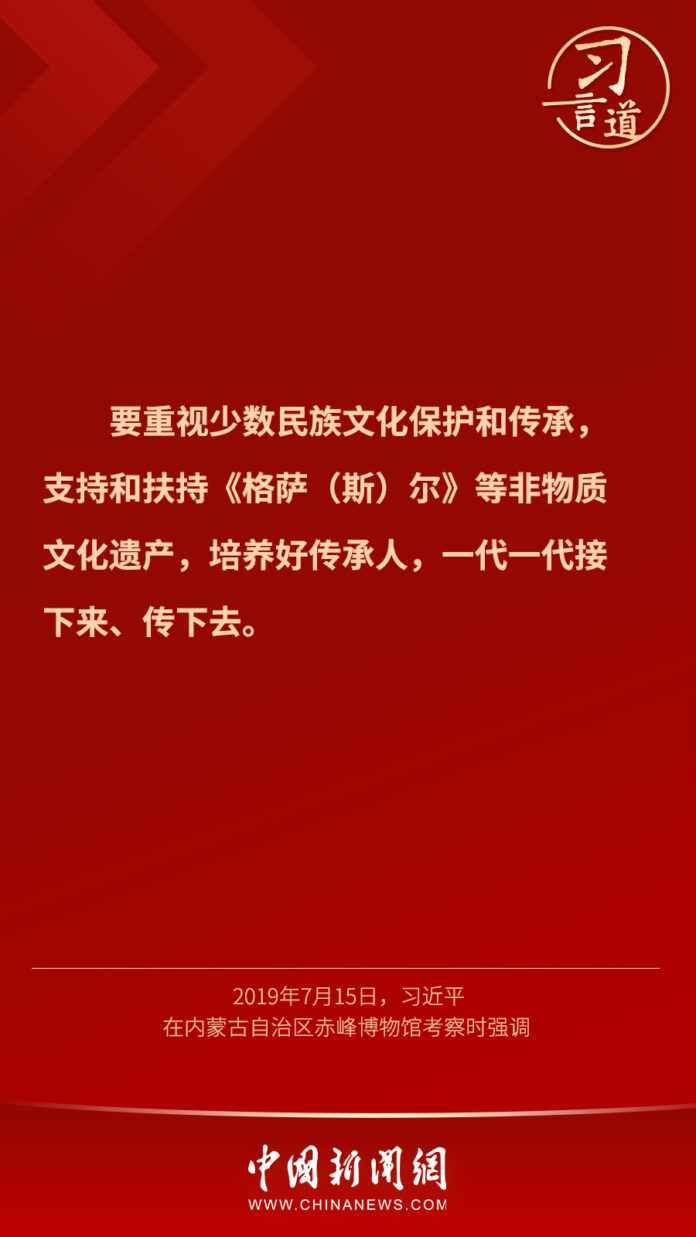 中國新聞HIGHLIGHT MEDIA亮點關注 習言道丨“培養好傳承人,一代一代接下來、傳下去” By Mei - 2022 年 6 月 1 日 《格薩爾王》是我國著名的少數民族史詩,以口耳相傳的方式傳唱了千年。習近平總書記十分重視少數民族文化的傳承和保護,他曾在多個場合提及這部“偉大史詩”。