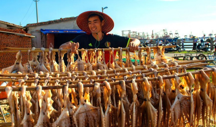 美好生活 北海秋分映暖阳 疍家渔民晒鱼忙 By guojiribao - 2018 年 9 月 25 日 0 213 每年的9月22日或23日是农历二十四节气中的秋分,南方的气候由这一节气起入秋。连日来,广西北海艳阳高照,正是晒鱼的好时节,当地地角镇渔民在晒渔场里忙得不亦乐乎。 地角曾是北海的一个小渔村,疍家渔民的主要聚居地,世代以渔为生,现在发展成为广西北部湾畔的渔业重镇。 9月23日,广西北海市的渔民趁着艳阳天晾晒海鱼 晒渔场上的墨鱼 鸟瞰晒渔场 晾晒章鱼
