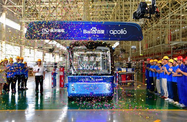 资料图片:7月4日,由百度与金龙客车合作打造的L4级自动驾驶巴士“阿波龙”在福建厦门量产下线。(新华社)