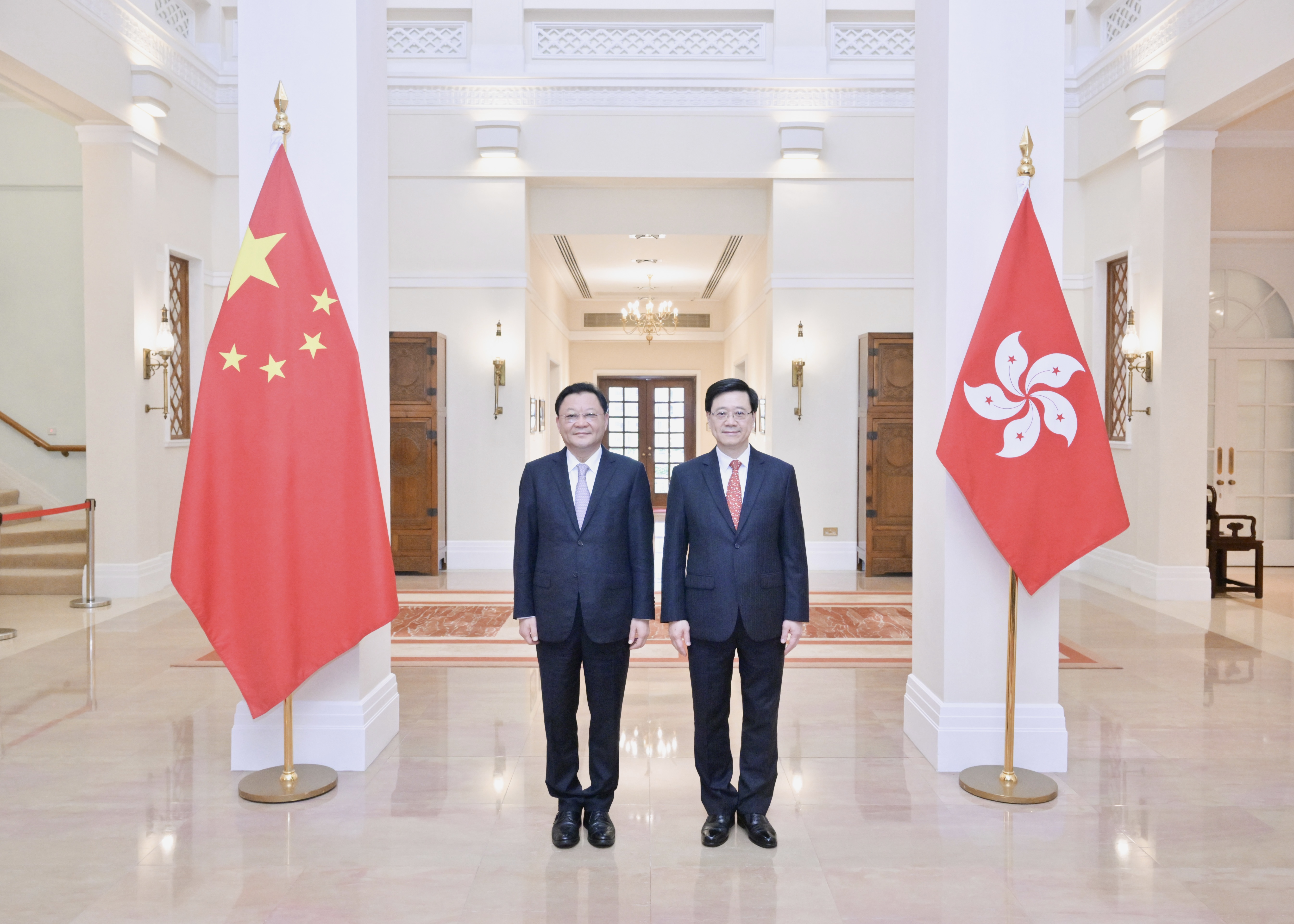 图:行政长官李家超昨午在礼宾府宴请来港出席粤港合作联席会议第二十三次会议的广东省代表团,并与广东省省长王伟中合照。