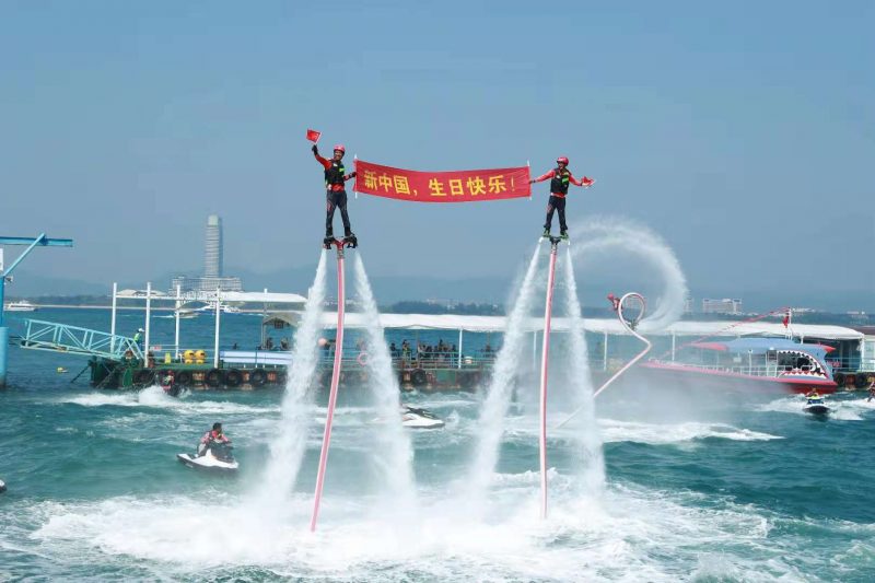 上午十点,一曲《好运来》在蜈支洲岛码头响起,69名演员身着红衣陆续从人群中走出,和着欢快喜庆的音乐翩翩起舞,引来现场游客驻足围观,不少游客还在演员们的带动下一起跳舞、拍照,为祖国打call。在码头的另一边,水花飞溅,尖叫声、喝彩声不断,海面上,海天飞舞、摩托艇、滑水等水上项目表演,热闹非凡。教练们手持小国旗和“新中国生日快乐”的横幅,摩托艇在水中划出“69”的字样,寓意新中国69周年华诞,以海岛独特的水上表演为祖国母亲献上一份别样的生日礼物。此外,潜水员和美人鱼们也在水下为祖国送上祝福。