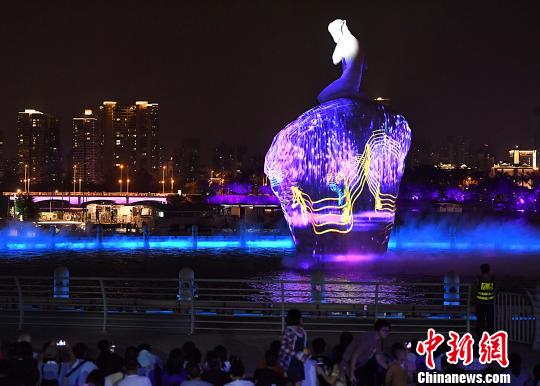国庆假日,厦门白鹭洲公园白鹭女神灯光秀吸引了许多游客和市民前来观赏。 张斌 摄